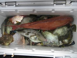 3:45そぼ降る冷たい雨の中剛世君のお迎えの車に荷物を積み込み出発し道路の凍結を避け江川崎から松野町周りで北灘に到着したのが7:00前そのころには雨もほとんど感じないほどになっていました。寝坊した船頭を起こして出船しのが7:30ごろでした。向かったのは観音崎を沖に出た真鯛のコワリ。到着と同時に雨が強くなり1日中ほぼ万遍なく15:00の納竿まで止むことはありませんでした。釣果(3人)は,カワハギ・ウマヅラがで60数枚,チダイ2枚,真鯛1枚でとにかく寒い1日でしたが何とか頑張りました。今年最後の釣行に雨なんて剛世君の日ごろの行いの悪さを今日ほど恨んだことはありません。