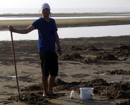 以前より約束していたマテ貝捕獲に3人で行ってきました。17:00干潮のため余裕の潮干狩りとなりました。現場であるファミリーキャンプ場へ到着したのは14:00を少し回ったくらいで海は海岸が見えないくらいの感じで”師匠”であるのりあき曰く「ここでこんなに潮があるのを初めて見た!」まさか潮時を間違えたのか?(よくある話)と3人で誰もいない海辺を見つめていたら助手席に鍬の柄が見える軽の箱バンで地元の貝堀師らしき人がやってきたので一安心!するとそのおじさんが私によって来て「マテ貝掘りは初めて?」と聞くので「初めてです」と答えると「17:00くらいにもう一度来るのでその時とっておきの取り方を教えるので待っていなさい!」とのことだったので「よろしくお願いします師匠!」と半信半疑ながら頭を下げると私の着ていた「黄色のTシャツを目印にくるから何処にいても大丈夫!」と言い残し箱バンでどこかへと去っていきました。(私の着ていたのは黄緑色のTシャツでした) そして見る見るうちに潮が引いてきたので3人で潮干狩り開始!1時間半程度で一人20枚程度を捕獲し疲れ切っていた時そのおじさんが登場!「捕獲した獲物を見てこれなら5分で取れると高笑いしたかと思うと黄色いシャツのお兄ちゃんやり方を教えるのでついてきて」というので私一人潮とバケツだけ持ってついて行くと」何とそのおじさんが砂を掘り穴を見つけてくれ私はそれに塩を入れ出てきたマテ貝を捕獲するというやり方で取れるは取れるは・・・。一人では手が足りないのであとの二人も呼び3人で塩を穴に入れて取れるは取れるとれる。あっという間に3人とも三桁を達成。途中からは,おじさんを師匠と呼びのりあきは,ザコ師匠となりました。帰り際に「またおいで」というので来月来ますと答えると鍬を担ぎ後ろ手を振り格好良く去ってゆきました。あっそうそうのりあきはおじさんに”黒いTシャツのお父さん”と呼ばれていました。私は”黄色のシャツのお兄さん”でした。 |