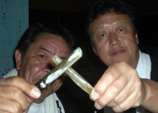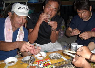 人生5回目のマテ貝捕獲に4人で行ってきました。ことの発端は,8/26寺村真夏の集いの打ち上げのときマテ貝の話題となり急きょツアーの話に・・・。8月31日に行けるのは4人で役割分担は,以下の通り!生ビールを構える(よっちゃん)炭をおこす(しゅうじ)会場の準備く(しゅうしん)マテ貝調達(4人)と役割が決定しその日の飲み会はお開きとなりました。 貝堀り前日にしんじからマテ貝ツアーの確認コールがあり”食材調達班”の掘行は決まりに・・・。その後しんじがよっちゃんとこに行って「ジョーレン借りていくぜ!」と言うとよっちゃん「そんなもん持って行ってどうするや?」しんじ「掘るのよ」よっちゃん「何おや?」しんじ「砂よ!」よっちゃん「砂掘ってどーすらーや?」案の定なんにも覚えてない(泣)!しんじ「おれらーが貝を掘ってくるけよっちゃんが生ビール構えるって言いよったやいか!」よっちゃん「おーそー言やーそんなこと言い寄ったねや」といつもの感じで話はまとまり役割分担が本決まりとなった。(特に寺村の飲み会のとき決まったことがらについてはこのようなことが多いのはご承知の通り!) 16:30干潮のため12:00佐川で待ち合わせし,しんじのエルグランドに資機材を積み込み出発!今回は,塩5kgを準備し大漁への備えは万端!しかしながら宴会の食材調達となるとやっぱり師匠が頼り!師匠が現れてくれることに期待し出発!有明ファミリーキャンプ場へ到着したのは13:30くらいでした。海を望むと台風10号の余波なのか今まで見たことないくらい波が高く海水は濁りポイイトは,まだ海中に浸かった状態でした。 30分くらい経つと潮はかなり引き貝堀りができる状態に・・・。取りあえずできる場所から始めたものの前回と違い貝の穴をなかなか発見することができません。ポツポツは取れるもののとても宴会ができるほどの掘果には程遠くこうなると頼みの綱”師匠”の登場を待つばかり!しかし周りを見回すも未だ姿をお見せにならず!一同に漂う絶望感と襲い来る疲労感!諦めかけた15:00頃ふと堤防の方を振り返ると肩にジョーレンを担ぎ颯爽とこちらひ向かってくる小さな人影が・・・。私は一目で師匠であることが確認でき知らぬ間に師匠の方へ駆け寄っていました。聞き覚えのある声で・・・。「取れますか?」と師匠!「いえ全然だめです」と私。と1ヶ月ぶりのあいさつを済ませ早速いつものパターンに・・・。しかし今までとは違い師匠が掘れども穴が出てきません10分ほどやったでしょか?それでもほとんど取れません。師匠をもってしてもと一同に再度襲いかかる絶望感!すると師匠が「高知からせっかく来てくれたのに手ぶらで帰らすわけにはいかん!」といつものポイントを離れる決断を下し,取りあえず師匠と私が次のポイントへ師匠の車で移動して取れることが確認できたら後の3人が合流することになり私はバケツと塩だけ持って師匠に連れられ移動!師匠が砂を掘り穴を見つけてくれ私はそれに塩を入れ出てきたマテ貝を捕獲するという得意のやり方で取れるは取れるは・・・。3人にも連絡し合流そこからは面白いように掘れば複数の穴があらわになり今回も2本の手が足りず”借りた猫の手も忙しい”ことになってしまい!あっという間にバケツが重くなり2軒で持参した塩5kgもほとんど消費していきました。そして16時前師匠が突然”水戸黄門”を視聴されるために帰宅されたのでそこからは男性陣が掘り女性陣が塩を入れ捕獲という方式で楽々三桁を達成。その後16:30師匠が「途中からになったので水戸黄門見るのあきらめました」と私たちに再度合流!それから持参した塩がなくなる17:00まで頑張った結果4人で400枚近い大漁となり寺村で待っている者ども達に大きな顔ができると胸をなでおろしていました。今回も師匠に鍬の使い方,掘るポイントなど指導を受けまた技術アップした私たちでした。帰りには運転手を駐車場まで車で送っていただき今回も師匠がいなかったらと思うと・・・。師匠本当にありがとうございました。そして帰りの車中しんじの助手席で最高のビールを飲みながら気分よく帰路につきました。寺村に帰った時には,みねちゃんの家の駐車場に炭も起き生ビールもセットされ大勢で夜が更けるまでマテ貝に舌鼓を打ちバカ話に花が咲きました。 |