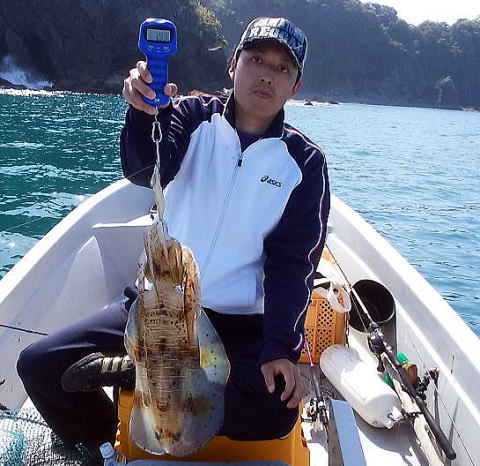 波も高くうねりもある予報でしたが行ってきました須崎沖!川上水産でレンタルボートし9:00調度に釣開始。はじめは大したことないように感じながらのエギングでしたが1時間もたたないうちに座ってシャクらないと危ない状態になりしかも当たりはなし!少し浮気(タイラバ)してみるもののこれまた当たりなし!そうこうしているうちに吐き気も襲ってきたので湾内に避難することに・・・。しかしイカの反応は全くなしで釣れたのは35cmのマハタとオオモンハタのみ何とか夕刻にしんが900gのアオリイカ私がコウイカを仕留め何とか夕飯のおかずにはありつけました。 | |||||