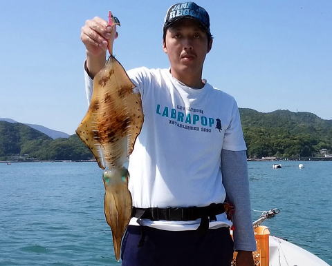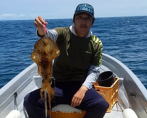 6月になって1回目の釣行!例年6月〜8月に釣行は控えていますが,今年は梅雨入りもせず涼しいのでイカを釣ってやろうと行ってきました。7時過ぎに自宅を出発し野見の川上水産に着いたのが7:45といつもより早い到着に当然大輔船頭のお迎えはなく電話で呼び出しレンタルボートに荷物を積み込み8時前に出港し沖に出てみましたが,波長の長い大きなうねりがありかなり釣りにくい状況でしたが(予報では1.5m)タイラバを落とし船酔いに耐えながら頑張ってみましたが釣れたのは,フグ1匹だけ!真鯛を諦め少し移動しエギングに・・・。そこで耐え切れず私はダウン!隣から聞こえるスピニングリールのドラグ音を子守歌に心地よく1時間ほど寝ていました。 起きてみるとしんが858g(写真)を筆頭に良型を4杯仕留めていました。その後湾内に移動し3杯を追加し16:30納竿としました,釣果は二人合わせ7杯でした。(私が小さい方から2杯!しんが大きい方から5杯) |