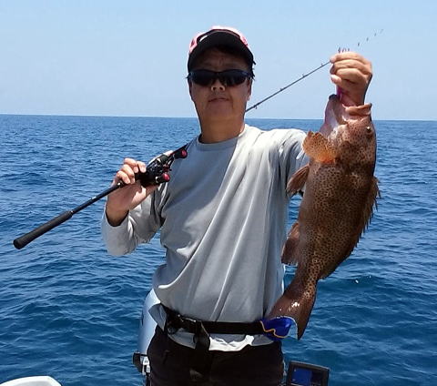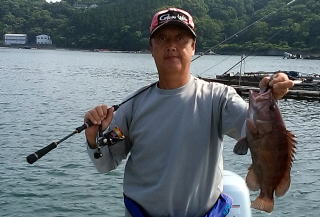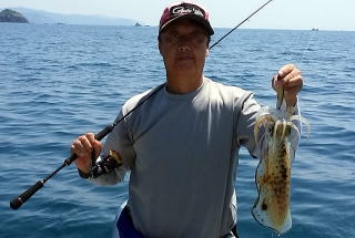 | 朝9時に自宅を出発(いつもよりかなり遅い時刻)野見湾(川上水産)を出港したのは10時を回っていました!時間がないので近場から順次攻めていきます。波もなく風も程よく吹き晴天で暑さを心配したのですが程よい釣り日和でした。中の島を出てすぐのポイントで何と1投目でアオリイカを幸先よくゲット(写真参照)!まずは,お土産ができ一安心となったのですが後が続きません!苦し紛れに船団ができている近くを流しながらジグをシャクっているとそこでいきなり当たりが・・・。52cm良型のオオモンハタゲット!(写真参照)続いてしんには小さいながらも真鯛がヒットしお土産確保に成功!その後13時からは,イカ狙いに集中するも不発!帰りに湾内でワームで43cmのマハタを追加し16時半納竿!短時間にしてはまずまずの釣果となりました。 | ||||||
