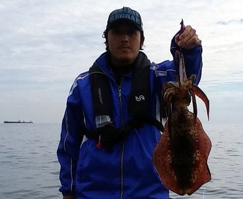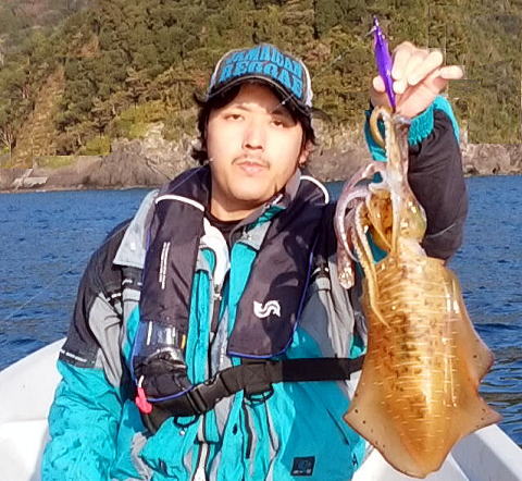 12/8の12月2度目の釣行(イカを狙い)に行ってきました。 朝7時40分に自宅を出発しコンビニ経由で野見湾(川上水産)へ・・・。ボートに荷物を積み替え8時30分出船!まず向かったのは,前々回と釣果のあったポイントへとボートを走らせました。 波とうねりともなく風も程よく吹き釣りやすい状況でした。まず第一投でしんがいきなり1.3kg(写真参照)をゲット!これは幸先良いと喜んだのもつかの間以降昼過ぎまで釣果なし!エギングをあきらめ諦めポイントを移動し今度はタイラバ&ジギングに移行し1時間半ほど粘ってみるもこれまた釣果なし!再びエギングに移行し14時30分やっと私に600gがそして立て続けに500gもゲット!しんも500gを追加するも後が続きません。16時半まで粘ってみたのですがこの日は二人で4杯でした。 |