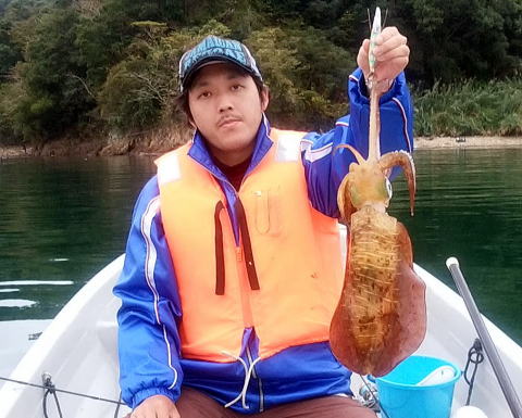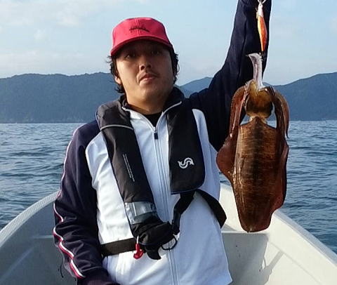 再度”イカを確保せよ!”との指令をけ行ってきました。朝7時に自宅を出発し野見へ・・・。8時前には到着しましたがすでに他のお客さん7隻は,すでに出発していました。いつもより1時間も早く起きたのに…。前回と違い今日は午後から波も高くなりうねりも出るとの予報でしたのでさっさと荷物をレンタルボートに積み込み大輔船頭の話も聞きくさしいざ出船!前回釣果のあったポイントへと一目散にボートを走らせました。 前回に比べ波とうねりがあり風はなく気温は夏日という変な感じでいきなりTシャツ1枚にいざ第一投!しんの穂先に引き込むあたりが!合わせを入も決まり写真の1kgを幸先よくゲット!立て続けに同サイズを再びしんが仕留めると今度は私にも1kgのアオリイカが立て続けにヒット!します。直後にしんがばらしたのをきっかけに当たりが遠のいたのでポイントをランガンするも本命には出会えずじまい。波とうねりが強くなったので移動することに!途中試運転中の大輔船頭とすれ違い湾内へ!そこで300gを2杯追加し16時半に納竿し港に帰ると笑顔満面の大輔船長が…。聞いてみると試運転中外海で何か浮遊物を発見!死体かと恐る恐る近づくと何と25kgのクエが生きたまま浮いていたとのこと!玉網で何とかゲットしボートに引きずり込んだとか…。イカ釣りゆう場合ではなかった! |