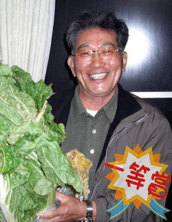 | 3連覇をのがし残念ではあるが”白菜のかず”の健闘は、心よりうれしく思う。これで来年からの栽培にも力を注ぐことができるというものだ。今年は昨年残った種をそのまま使ってみたが十分戦えた。来年は、基本に戻り10kgオーバーでかずの連覇を阻止する!チャンピオンに一言言っておくが、その笑顔がいつまでも続くと思うな!今回の君の優勝は私のプレゼントだ!来年は私の実力を必ずや証明してみせる!! |