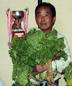 最初に軽量台にあがったのは,2年ぶりの優勝を狙う”やす”の白菜!見た目は見事なできばえに見えるが今一葉の詰み方に不満が残る・・・。軽量の結果6.1kg,常に10kgクラスを育て上げ出品してきた”やす”にとっては,不満の残る成績となった。次に軽量台にあがったのは,”かず”見るからに重量感を感じる見事なできばえで”やす”の白菜を超えるのはひと目で感じ取られた。結果は,8.4kgこの時点でいつものパターンで優勝は,”かず”に決まったかのような空気が会場を覆った。最後に軽量台にあがったのは,白菜カップ界の”横浜ベイスターズ”こと”まさ”昨年まで11大会連続最下位の記録を更新中で優勝からも12年遠ざかっている。しかし今年の白菜は,いつもと雰囲気が違いひと目でやる気を感じる仕上がりである。軽量の結果,”かず”100g上回る8.5kgで12年ぶりの優勝となった!!(優勝の喜びようは写真からご想像ください)