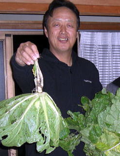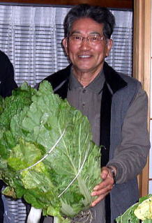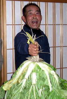 最初に軽量台にあがったのは,4年ぶりの優勝を狙う”やす”の白菜!見るからに貧弱で会場からは「鶏のエサにもならん」とのヤジが飛び交う中計量が行われる・・・。軽量の結果0.5kg,常に10kgクラスを育て上げ出品してきた”やす”にとっては,大きく不満の残る成績となった。次に軽量台にあがったのは,”かず”見るからに重量感を感じる見事なできばえで”やす”の白菜を超えるのはひと目で感じ取られた。結果は,7.2kgこの時点で”かず”の優勝が見えた瞬間であった。最後に計量台に挙げられたのは3連覇のかかる”まさ”の白菜。見た目では”かず”の白菜と遜色ないよう見えるものの計量結果は4.7kg。結果,”かず”が大差で3年ぶりの栄冠に輝いた。