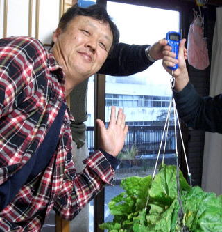 新年早々の1月6日(土)仁淀川町大崎の白菜のカズ”宅「鳳凰の間」に於いて第22回白菜カップが開催されました。今年の参加者は,昨年と同じく初優勝を狙う昨年2位の”EM菌大嫌いのしょうた”(37)とその直系の妹で昨年は,最下位に沈んだ”意外と負けん気の強いみか”(34)とともに最多の8回の優勝を誇り,永久シード権を持つ二人(連覇を狙う白菜のカズ(76)・2年ぶりの美酒を味わいたい「今年の敵は,慢心だけ」と豪語する三要素のヤス(56))。先ず最初に計量台に上がったのは,所要のため欠場となったものの白菜を兄に託した”みか”!凶作の2017年を象徴するような見るからに貧弱な白菜は,過去の最低記録500gを更新する470g!この時点で”みか”連年のビリが決定的となった。続いて計量台に現れたのは,連覇のかかる”カズ。ビニール袋に入っているものの見るからに白菜らしい白菜で4.56kgを計測しこの時点でトップに躍り出る。そして3番目に軽量台に上がったのは,昨年の2位が自信となりいつになく気合十分の”しょうた”。今年は”のりちゃん”の手は借りず独りで頑張ったと胸を張った結果は,先の二人を抑え5.0kgとトップに躍り出た!。最後に軽量台に上がったのは,2年ぶりの優勝を目指す”やす”見た目では他を圧倒するもののこればっかりは測ってみなければ分からないと言いながらも本人はほぼ優勝を確信したかのような得意顔で計量!6.50kgと他を圧倒する強さで史上最多となる9回目の優勝に輝いた。優勝した”やす”は,今季の凶作年を愛情と20年以上の経験で培った技術を持って見事に乗り越え22回大会の幕を閉じた。