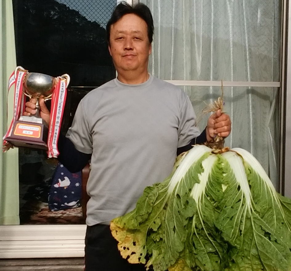 今回は,新型コロナウィルス感染が拡大している状況を鑑み祝賀会は,後日コロナウィルス終息後に実施することとし,計量と表彰のみの開催となりました。今年の参加者は,初代王者”無農薬有機栽培のまさ”の1番弟子である”のりちゃん頼みのしょうた”(40)と永久シード権を持つ二人!2年ぶりの覇権奪回を心より願う”白菜のカズ”(79)と二連覇を狙う過去最多優勝回数を誇るテクニシャン”三要素のヤス”(59))。最初に計量台に上がったのは,いつになく気合の入った覇権奪還に燃える最年長のカズ!見た目には,しょうたに劣るものの重量感を感じる白菜らしい良型白菜!自己記録(9.2kg)に迫る8.0kgを計測する。続いては,見た目にはなかなかの出来に見える正太の見るからにおいしそうな白菜!しかしながら毎度のごとく期待外れの4.8kgに終わり初優勝は逃してしまう。最後は,本命中の本命”やす”の白菜が計量台に・・・外の葉が落ち少し重量は減ったものの見るからに重量感を感じる貫禄の白菜は,9.055.kgを叩きだしし見事連覇と史上最多11回目の優勝を果たし第25回の記念大会の幕を閉じた。