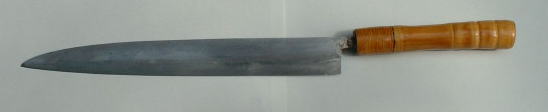チヌの料理用にヤスリから削りだした苦労モノ,研ぎあげるのに1年を費やした苦労の賜。切れ味も抜群でひげが剃れるほど。