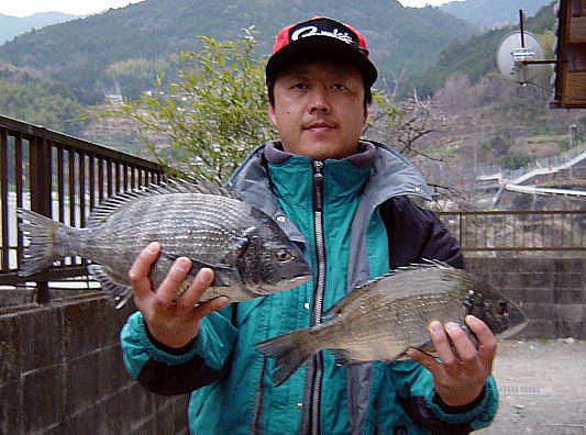 左が中央カセにて朝の3投目ボケで仕留めたチヌ,右が造船所前にてオキアミで仕留めた39cmのチヌです。”ダンゴも持たんつなめちゅうね”と大輔船頭に言われながらも2回しかなかったあたりを見事に捕らえるあたりがすばらしい集中力!最近バラシの連続でこれ以上慎重に出来ないと言うくらいにあげた1匹目。