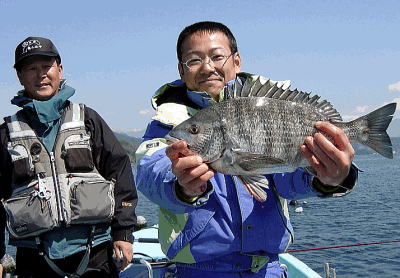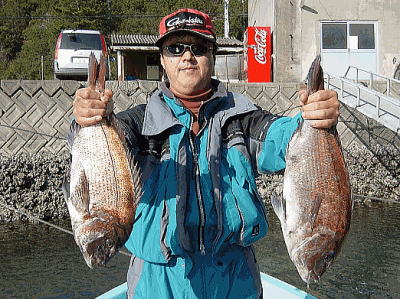 その後連荘で真鯛53・47cmを連続ゲットし私は昼食にしました。カップラーメンをすすっていたまさにその時今まで音無だっだ井澤が急に大声を上げたので振り返ると何をヒットし格闘していました。使い慣れない65Rのスループの逆転をハンドルでストップさせる妙技を披露している井澤の姿がありました。3分後水深37mから姿を見せたのは腹の大きい45cmの本命でした。
