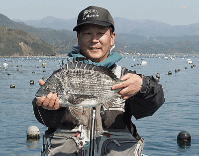 チヌかかり釣り初挑戦の田中さんを含め井澤と3人で望んだ北灘釣行。3/8の夜着いた瞬間,清家船頭に”いい時来たね〜今日年無し2枚あがったよ”のきつい一発。お得意の”昨日までは良かったのに”パターンかと臨んだ3/9は早朝から霜が降り気温は下がり水温も14.2℃と冷え切ってました。7:00に港を出港し真珠の養殖ロープにボートをかけ釣り開始,朝一から全く当たり無しの状態が続いて向かえた10:00気温も上がり暖かくなって来たかと感じ始めた頃始めに上がってきた最初の外道は”コウイカ”(胴長)25cmでした。