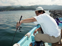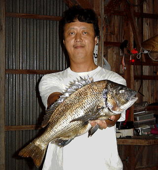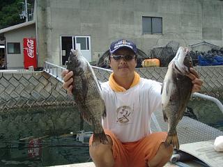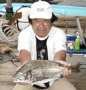 | ひろみち君と2人で臨んだ北灘湾,得意の殿様出勤で筏を出航したは11時,向かった先は小学校よりまだ南楽園よりの真鯛コワリ(ダンゴポイント水深28m)で釣り糸をたれたのは11:30でした。最初からそれれらしき当たりもあり,1枚目(カニ)をあげるにはそれほで時間は要りませんでした。待望の年無しクラス(49.5cm)が来たのは12時を少し廻った頃でした。サナギをダンゴに包み落とし込み割れてから5分位が経過したころ突然の当たりが,大きくあわした瞬間ヒットを確認,その後なかなか底を切れず半ば強引に底をきる(ボラか?と思った)と中層でも強い締め込みが,それもナンとかかわし上がってきたのは年無しを確信するほどの丸々と肥えた北灘のチヌ(49.5cm)でした。その後45cmを1枚加え,私が3枚,ひろみち君は最後の1投(丸貝)で30cmを仕留め4枚,この日は半日で合計7枚(25.5cm〜49.5cm)でした。その翌日は,昨日よりもう少し南楽園よりのコワリ,朝から出足は最悪,私が2回のバラシ(ロープに巻かれてのライン切れ)ひろみち君も1回の針はずれ,しかしその後はひろみち君の一人舞台,立て続けに3枚を仕留め,4枚目にはカニで自己最長寸(上の写真参照)をゲット!!しその後も1枚1枚を加え計五枚,私も何とか終盤に5枚を揃え面目を保てました。そして午後2時半に納竿しました。北灘初年無しは,次回(明後日・明々後日)に残しておくことにします。 |