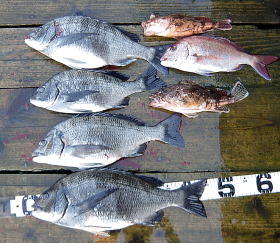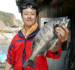 朝一の第1投目,二人のたれた針に同時ヒット,安彦35cmやすし43cmをゲット。何とも幸先良い出足,第2投目で安彦が42cmをゲットしこのまま行くと何枚釣れるのかとの不安は,すぐに一層しました。やすしが9時底を切ることも出来ず針外れで1枚逃してからは,安彦の1枚(46cm)だけに終わってしまいました。大潮なのに潮は流れず誘いを入れるも反応無しの辛い釣りとなりました。しかし2人で4枚のチヌに出会たことには満足してます。