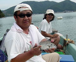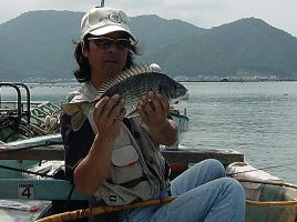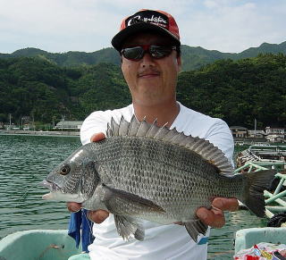 前日張り切りすぎたのか?腰痛持ちの2人に連続の釣行は,きついものがありました。朝6時には,起床し,竿を出したのは6:30ごろで,本日の釣行者は,チヌ狙いが私たちを含め4組でした。今日は一発大物狙い!で元ノ浦前の小割にボートをかけました。しかし,昨日とはうって変わり上層には小アジの大群であたりすらとれませんでした。(スレあたりが凄いため)こらえ性が無い私たちは即座に移動,昨日の場所で再び糸を垂れました。(周りにはチヌ釣りが2隻4名いました)するといきなり30cm級の真鯛が私の竿を曲げました。続いてサナギの遠投に居付きのちぬ(42.5cm)が来てまず1枚,続いてやすひこにも同型(42.5cm)が1枚来ました。その後強風との戦いが続くも私が40cm級を2枚(生ミック・まるこ)追加し納竿としました。