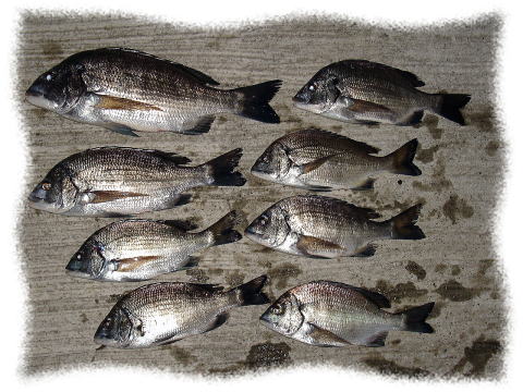 家でゴロゴロするのはもったいないと思い北灘釣行で余った団子を持って望んだ2週間ぶりの野見湾。突然思いついての釣行だけに餌は,オキアミと刺アミのみ超経済的ではありましたが釣果はほとんど期待してませんでした。朝一に大輔船頭が開口一番「シラサ持ってきた?」持って来てないと答えると「今日は厳しいかも?」との見解。先に4号へ上がっていたお客さんがシラサをたくさん持ってきていたとのことだったので1人ぼっちの造船所カセを選択しましたに。朝9時に竿を出すも当たりはなし,「釣れたらまずチヌと思って間違いなし」とのことだったのでねばり強く団子を打ち返していたら11時最初の当たりが,合わせも決まり上がってきたのは30cm強のチヌ。それ以降は突風との戦いでした。買ったばかりのパラソルも危うく飛ばされそうになるし大変でしたが12時回った頃から風も収まりやっと釣りモードに,その直後38cm(刺アミ)を上げるとそれ以降はチヌが団子を割り刺し餌にも当たるという爆釣モードに入り,刺アミで4枚,オキアミで1枚(30cm強)を追加しました。その後ボラが沸きオキアミでは厳しくなって夕方を迎えました。一向にボラは減らず団子にアタックしてきましたが,その合間をかいくぐり2号の針に針ぐらいの大きさの刺アミを付け団子を落とすとボラがすぐさま割ってくれました。その後そこにはわせ待っていると小さなあたりがあり出たかと思うと穂先をいきなり水中へ,合わせを入れると確かな重量感が竿に伝わってきました。明らかにボラとは違う引きで上がった来たのは本日最長寸の42.5cmのチヌでした。その後は,1枚も上げることができず午後4時に納竿しました。シラサを持って行っていたらと後悔しても後の祭りでしたが十分な釣果でした。