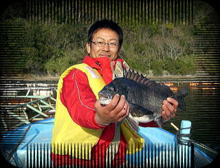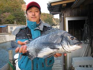 出足は,アジの猛攻で攻めあぐねていましたが夕まづめもちかい15:45風が弱まってまもなく私の竿に突然の前当たりが(ボケ)きました。すかさず明確に本当たりも出て合わせも決まり2・3回ラインを出し締め込みをかわし上がってきたのは49.5cmの体高のある丸々したやつでした(上げたとき測ったら51cmあったのですが・・・)。その直後に井澤も1枚目40cmを取り込み,迎えた16:40まず井澤が隣で竿を曲げる。その2秒後私にも当たりがありダブルヒット互いに取り込み井澤47cm私のは40cmでした。その数分後私に年なし間違いなし!と思わせる引きと重量感が,やりとりした末に上がってきたのは年なしにはほど遠い41cmのチヌでした。何とスレで上がってきました(抵抗するはずです)それ以降当たりが遠のき納竿としました。強風の中短時間の釣行でしたがまずまずの釣果でした。