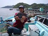 チーム自己満族”恒例のGWの釣行”で北灘湾(レンタルボート清家)へ今年2回目の釣行となるひろみちお兄さん・ここ3回連続で釣行時に信じられないくらいの荒天(大風&大雨)に見舞われメンバーから一緒に行きたくない釣人No.1に選ばれ本人も少しナーバスになっているたけとし君・今年最初のチヌゲットに密かに闘志を燃やすひこ・そして2桁&年なし狙いの私の4人で行ってきました。朝3時に佐川を出発し途中食料と餌を購入し清家に着いたのは夜もすっかり明けた5:30でした。(めっきりと夜明けが早くなった気がします)GW最終日ということもあり桟橋は,大勢のチヌ釣り客でごった返しているかと思いきや,皆さんすでに出船された後のようで数組のお客さんがいるだけですんなりと出船できました(駐車場は溢れんばかりでした)。今回の組分けは,わたしとひろみちお兄さんの寺村小学校先輩後輩チームとたけとしと君やすひこの大崎小学校先輩後輩チーム(犬猿の仲チーム)に別れそれぞれのボートに乗船し向かったのは,北灘でも比較的水深が浅く(27m)風の影響が出にく釣りやすい国延沖コワリ。このチョイスが2チームの勝敗を大きく左右することになるとはこのとき誰も思ってもいなかったでしょう。最初に大崎小Tが湾口側の丘よりに付け,その少し湾奥の湾中よりのコワリにわたしたち寺村小Tが付け300mの距離で斜に向かい合った状態でFishing Stert!となりました。朝一から当たりもあり真鯛(30cm程度)はポツポツ上がったのですがそれからは生命反応が消え赤潮が潮流に乗り流入してくる最悪の状態となってきた8:45私の携帯に写メが入ってきました。送り主はたけとし君でタイトルは*”ごめん”でしたがタイトルで1枚目をゲットしたことが即読み取れたので”データが大きすぎて読み取れませんでした”と付けて返信しました。その後も10:00再び写メがタイトル”ごめんね×3”と嫌がらせのように届きます。時合かも知れないのにそんな暇があったらもっと釣りに集中したらいいのにと思いながらもたけとし君の携帯に電話を入れ確認するとたけとし君は30cm級を3枚仕留めたもののやすひこは真鯛と戯れいまだボーズと聞き少し胸をなでおろす私たちであったことは言うまでもありません・・・。しかしこれが逆にやすひこが3枚,たけとし君がボーズの展開だったらきっとやすひこは海に転落(突き落とされた)していたことは間違いなし!その後11:00弁当船で現れた清家さんに”これはダメ!場所替わりさいや”と則され私たちは大崎小Tを国延沖に残し小学校前へ単船移動となりました。小学校前には先客が1名おられましたがスカリには10枚程度のチヌ(良型混じり)が確認できました。(期待大)第一投から反応があり雰囲気も上々で結果的に移動が正解でした。12:00私がオキアミとボケで連続2枚(30cmクラス)を仕留めボーズ脱出,ひろみちお兄さんも大物を掛け(写真参照)私の処女作であるイモリ竿(模様がイモリの腹に似ているとやすひこ命名)が180°曲がっているのを私は見た!へし折れるほどのやり取りで頑張るが約1分後3.0号ラインが音を立てて吹っ飛び万事休す!(それから少しの間全身の力が抜けて落ち込んでいるひろみちお兄さんの抜け殻が私の傍らにあったことは言うまでもありません(泣))そこに絶好調男たけとし君からタイミングの悪い電話が・・・”年なしをゲット”(写真参照)とのことでご丁寧に餌やら釣ったときの状況や合わせに至るまで頼みもしないのにベラベラと・・・長文にわたりそうなのでここでは省略させていただきます。(後の計測で54.5cmたけとし君の自己最長寸とのことが判明しました目出度しめでたし)やすひこも45cm(写真参照)を筆頭に追い上げているらしく大崎小Tはご機嫌のようでした。(もし逆転したらやすひこは海に突き落とされるのに・・・)しかし元来楽天家のひろみちお兄さん気を取り直し35cmと45cmをオキアミで仕留めて2008年のボーズ脱出,ご機嫌も直り目出度しめでたし!(流石です)こうなると私も引き下がるわけには行きません何とかデカイのをとせっせと打ち返した結果!?15:00に40cmをカメジャコ(小)でそして最後の最後やっとこさカメジャコで念願の年なし(50cmジャスト写真参照)を仕留めることができました。枚数も型も負け,どう考えても納得のいく釣行とはいえませんでしたがリベンジは,近いうちに必ずや・・・最終結果は,ひろみち兄さん2枚(最長45cm)+私4枚(最長50cm)=6枚(寺村小T),たけとし君10枚(最長54.5cm)+やすひこ8枚(最長45cm)=18枚(大崎小T)で大崎小Tの圧勝で2008GW釣行は幕を閉じました。