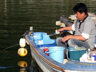 低気圧の影響でか外海は、湾内からも白波が確認できるほどの大荒れで湾奥の造船所あたりへも少なからず影響があったのか?カセを係留したロープが“張ったり・緩んだり・ラジバンダリ“そのたびカセから前に頭からツッコケそうになるくらいの衝撃が・・・カセの傾きもありとても立っていられない不安定さでそうこうしている内に突然の吐き気と頭痛が私を襲う(そうです得意の船酔いです)遠くを見たり深呼吸をしてみたりやってはみますが特効薬とはならずつらい時間が過ぎてゆきます。8:00”まちゃあき”も到着しかし重量級2人がこのカセに同乗は無理と判断し西向きのカセにあがることになりました。時間は経てども私の船酔いが好転することはなく穂先を見つめるのも辛くなり遂には筏の上で横になることにしました。(当然のことながらこの時点でチヌの気配すらありませんでした。いやチヌどころではありませんでしたが正しいかと思います。)