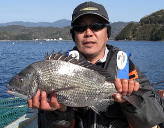 「まず団子を打ってからが・・・」との船頭のアドバイスでミンチさなぎと赤アミを団子に包み5個ほど打ってから準備し,まずはボケで攻めてみるも穂先に伝わってくる反応がありません。オキアミ,カニ,ネリエとローテしてみますが,1時間ほどは生命反応がありません。そして8:00にオキアミを付け餌に底から5mのところで団子を割り落とし込むといきなりフリーにしてあるリールのスプールが高速回転!45cmほどの真鯛でした。そして程なく剛世君に今年最初のチヌが挨拶に現れます。オキアミコーンを2m程はわしたところへいきなりのあたり!リールのスプールまで到達する見事なあたりながらのその時剛世君は,鯛のエアーを抜こうと席を立ったばかりでスプールの回転音に反応し,慌てて釣座に戻りやりとりを開始(写真参照)数回の締め込みを耐えあがってきたのは何と!51cmの年無し(ラッキーな男!)今年の初チヌを見事年無しで飾りました。(これで2009年の運を使い果たした・・・かも)