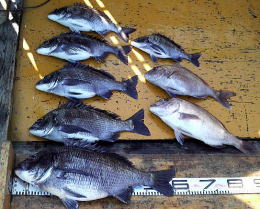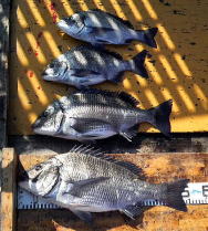昼前に30cm超を1枚ずつを追加し6:2になると昼過ぎに35cmと47cmをゲットし6:4と迫ってきた!そこで剛世君が私に一言!「完全にパターンを掴んだぞ!!」と豪語しましたが,それ以降チヌの姿を見ることはありませんでした。