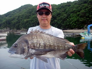 先月釣行最後に竿をまたごうとしてクーラーの上に置いてあった愛竿とリールを海中に蹴り落としてしまいそれがあがったとのことで取りに行ったのですが,せっかく宿毛まで来たのだからとあがってみた3号筏(たまたま必要な道具&餌は愛車に偶然乗っていました。)船頭さん曰く「今年はまだ3号筏で年無しが上がっていません!」とのこと「わかりました私が1枚目をあげて3号筏2010年の年無しラッシュ開幕としましょう」と適当な宣言をして7:00に第1投!たまたま持っていた付け餌は,オキアミ・かに・コーン・さなぎの4種類,天気は1日を通して晴れ,最高気温30℃と風も無く蒸し暑い空気が体にまとわりつく,潮は午前中は,山側へ午後は沖向きに激しく流れました。それと数日前の大雨で川から流入した浮きゴミで海面が埋まるほど一緒に流れました。午前中は,ゴミも無く釣りやすかったのですが釣れるのは,グレ(30cm級)アオブダイ・オジサン・アマギ・カマス(10cm級)・アジ(10cm級)アイゴ・ゴンズイで午後は潮が変わったのと一緒に流れるゴミのせいなのか何のあたりも出なくなりました。時合いがきたのは,16:00前で流れも緩みゴミもなくなった頃でした。コーンを落とし込んでみると中層でビリビリとした当たりの後送り込んでいると引っ手繰る当たりが・・・ロープに持っていかれながらもあがってきたのは43cmの元気なキビレでした。そしてクライマックスは17:00過ぎダンゴのオキアミのボイルを包み海底へ団子が割れた瞬間前当たりそしてゆっくり押さえ込んだ!「チヌだと確信し思いっきり合わすと見事にヒット!手に伝わる重量感・・・しかし思いだけでここのチヌにしては抵抗が無い!なんとも簡単にあがってくるではないか!水面に光る魚体を確認してびっくり!一目で年なしとわかる銀鱗!(少し痩せてはいましたが)今年初年なしゲット!!終わり良ければすべてよしとのことです。松沢さんによると昨日よりアコヤ貝を筏の廻りに撒いているようですので1週間くらいで例年の年無しラッシュが始まると思います。は,