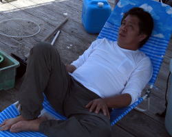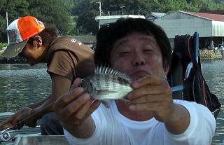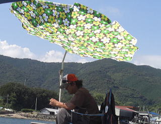 例年なら上層でグレチームとバリチームがサッカー(サポーターはエンゼルフィッシュ?),中層〜底ではボラがバレーボール大会(観客がヘダイとゴンズイ)のパターンなのですが今回は,そこで小さなカワハギが餌をかじる程度であまり活性は高くありませんでした。序盤釣れるのは,チャリ・カワハギ・ゴンズイ・ボラ・ベラ・カワハギ・オジサン・ハコフグ・シマイサギでしたが9:00過ぎ「小ちぬ名人」のたけとし君が本命(15cm弱写真参照)をゲットすると続けざま私以外のメンバーが小さいながら本命を仕留めていきます。そしてたけとし君はウサギと亀のウサギ状態に・・・ボンボンベットで横になって野次将軍に!(写真参照)私はといえばいつものごとく一人ボーズ状態が続いていましたが夕刻からの入れ食いを確信しつつ昼食後ボンボンベットで1時間強の睡眠をとらせて頂きました。不真面目な2人とは対照的に”だいすけ”と”しん”は真面目に穂先に見入ってました。だいすけに至っては,傘がお猪口になり日差しが体に当たっているのも気がつかないほどの集中力(写真参照)で自己最長寸チヌを狙いすましていました。