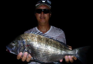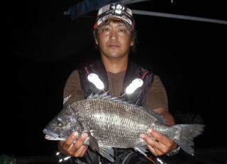 そして流れが緩んだ19::00しんの竿が大きく曲がる人目で大チヌを確信の瞬間痛恨のラインブレイクと同時に私にも特有のあたりが出る!着底少し前から穂先にビリビリといった感じの当たりが出て大きく2回送り込み出た鮮明な当たりをあわせ見事にヒット!喜ぶまもなくチヌは一気にロープへと向かいますが1枚目だけにいつに泣く慎重なやり取りを開始いつになく時間をかけ取り込んだのは52cmの本命(写真参照)。続いて大輔が力いっぱいあわせると今までとはぜんぜん違う引きが・・・たけとし君もタマ網を構え待機・・・その直後チヌがアンカーのロープへと・・・”プチィ”痛恨のラインブレイクで自己最長寸を逃す。いつもならここから入れ喰いが始まるはずなのですが何かがおかしいそれからあたりが出ない。