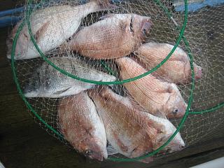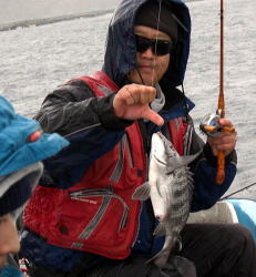 まず最初に竿を曲げたのは,いつものごとく釣座をカセの真ん中に構えたしん師匠でした。オキア生に40cmのきれいな真鯛でした。立て続けに40cm級を追加し当然のように涼しい顔でリールを巻く!船も心も揺れ釣りづらい状況ながら一筋の光がさした感じでした。海の活性は左俺ほど悪くはないようで次は私がオキアミで30cm弱の真鯛をゲット,その頃たけとし君は,ぶつぶつ言いながら,穂先をじっと見つめていました。私が車を洗ったから・・・と文句タラタラ・・・