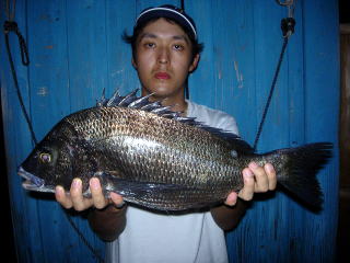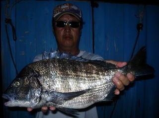何時ものごとく日没に備え,帰りの準備を整えアコヤ貝の落とし込みオンリーに切替!直後の17:40特に大きい貝をチョイスしチョイ投げで落とし込むと着底とほぼ同時に「わたし」の穂先が小さな前あたりのあといきなり海中へと突っ込んだ!何とかこっちのペースに戻し7mの海中から上がってきたのは50cmジャストの当然本命!続いては,遠投後(7m)ラインをフリーで出しながら落としていると中層で独特の当たりが出て合わせも決まりあがってきたのは一目で年なしとわかる52p。その直後にも50cmと35cm(あんなデッカイ貝をどうやって飲み込んだのか?)を追加,「しん」も40cm級を2枚追加し19:30納竿としました。