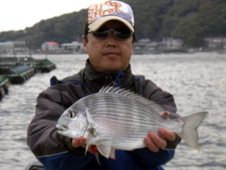 本年2度目のチヌ狙いの釣行でしたが,春の強風で私たちともう一方大阪からのお客さんの2組のみで(その他の方はキャンセル)湾の外に出ることはできず仕方なく狙いのポイントではない中央の緑のコワリorエビタンク前の選択を迫られたのですが,お土産も考慮し私たちは中央を選択,大阪のお客さんはエビタンク前に決定。7時過ぎ竿を出しました。そこからは45cm級までの真鯛が入れ食い状態で真鯛以外に魚がいないかと思わせる猛攻で何もできず時間が過ぎ,昼からはへダイの猛攻で・・・。その後は,五目釣り,ヤズ,石鯛,アナゴ,エソ,ボラ,へダイ・・・。結局今回もチヌを釣ることはでした。(下の写真は多分チヌではありません)エビタンク前では,本命が4枚あがっていました。次はGWに頑張ってみます。
