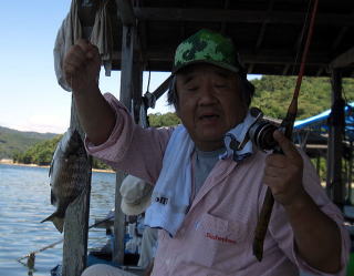 まず最初に竿を曲げたのは右端に陣取った憲夫さんで開始早々20cm級(本命)をゲット!以降キス,フグ,ゴンズイ,バリ,ヘダイ,チャリコなどの外道は釣れるものの本命は姿を見せませんでした。開始から1時間ほど経ったころ隣のひろみちぬさんが竿を曲げる!明らかにちぬの20cm級の感じでもう少しでタモ入れかと水中をの覗いてみると1mはあろうかという「アカメ」がちぬを人のみにして水中へと一気に潜って何もすることもできずに当然ラインブレイク!(私は見てなかったのですが実況音声は伝わっていました)船頭さんが言っていた「ちぬをかけたら素早く取り込んでください」の意味が分かりました。そのころ潮上で苦戦をしていた私にも本日の1枚目を練餌でヒット・・・まではよかったのですが右ひじの痛み(50肩?)が酷く右腕で竿を支えられない始末!まずまずの良型のようでそこそこ抵抗します!左手の力を借りながらアカメの攻撃を避けるべく必死に取り込もうとするものの右ひじの痛みに耐えられずかなり遅い取り込みとなってしまいましたが,何とか仕留めることができたのはこの日の最長寸となった35cmの本命で2年ぶりのご対面となりました。以降納竿の15時までまずまず楽しめ私も憲夫さんも1回ずつアカメをかけましたが他の同乗した2名が釣ったチヌを付餌にアカメを狙い始めて以降アカメも姿を消し平和な釣りとなりました。