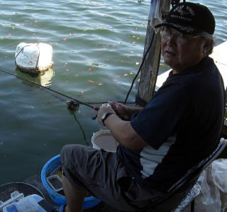 当日は,なんと4時起床!(こんな時間に起きて釣りに行くのはいつ以来かなと考えながら)憲夫さんがひろみちぬさんとわたしを順番に回収し釣り場へと・・・。途中ローソンと”奥田釣具”で自分の餌とちぬの餌を購入し高橋筏に到着したのは朝5時半!6時に渡船が他の筏に上がるお客2名の計5名を乗せ出発10分ほどで人生初の高橋筏に上がりました。