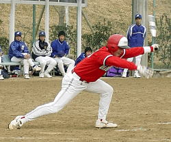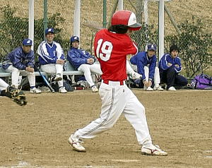 5回は,也寸志が中前打,修二も中前に落とし無死1・2塁とし,途中出場の剛が1・2塁間に転がし一死2・3塁となり1番隆宏が右犠飛で1点を返すが,厚男が良いあたりながら一直に倒れ,一点にとどまる。