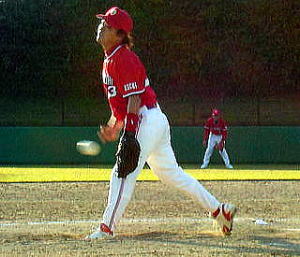 先頭「たいち」は左飛に倒れるが続く「だいすけ」が追い込まれながらもきれいな弾道で中前にきれいにはじき返し一死1塁(チーム初出塁)。続く「のりまさ」は会心の中越え二塁打を放つも「だいすけ」が本塁寸前でタッチアウトとなり二死。(だいすけしきりに反省)続く代打「たかお」も三振に倒れ攻撃終了。