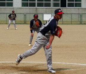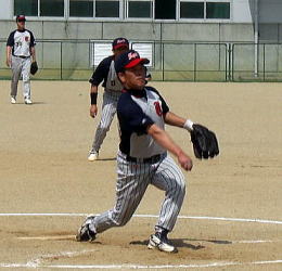 | 今年最高の14名で臨んだ今大会!ナイターも始まり毎週水曜日の練習の成果で打線はまずまずに仕上がったはずでしたが好投手の前に一桁安打がやっとでした。投手はほぼ期待通りの投球を見せてくれただけに残念です。これで今年も勝利なしの3連敗となってしまいました。 初回表片浩の中前打と久直の内野安打で無死1・2塁,3番剛世が送り4番晴彦の左飛犠打で先制!その裏2点を献上し1:2の1点ビハインドで迎えた4回裏リースキンの攻撃,二死1塁から相手打者の放った打球は内野への飛球となりチェンジかと思われた瞬間事件はおきた!それを追った遊撃手の石本とランナーが交錯転倒!(この時点で守備優先の原理から守備妨害が成立すると思った瞬間何と言う事でしょう何のジャジもなされず!何と3人の審判が打球を追って空を見ていたのか?(大謎)その事実を目撃していないという不運と言うかお粗末というか・・・)打球はひろまを掠りファウルグランドへ点々とし・・・二死1・3塁にその後盗塁で2・3塁となり次打者の安打で2点が入る。何とか気を取り直し6回表久直と剛世の連打と晴彦の右翼線への三塁打で1点差とし続く谷平のセカンドゴロ送球の間に晴彦がホームを落とし入れ同点とし行け行け状態となり,7回表先頭の代打伸二が敵失で出塁するもそれを送れず次の打者のいい当たりも二直併殺とチグハグで好機を逸し,その裏先頭に二塁打を浴び一死三塁から中犠飛でサヨナラ負けを喫してしまいました。なんとも後味の悪い負けではありますが”運不運”は試合には付き物と割り切るとともに次の試合に運を貯金したと思い気を取り直し1ヶ月後の全日壮年予選をその貯金を使い勝ち抜き富山に行きたいと思います。!?(謎) |
