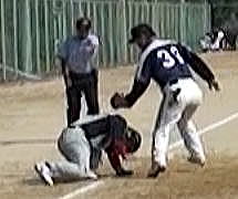 3回表尋喜の痛烈な打球が三塁走者憲昭のボディを直撃