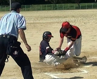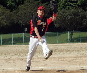 序盤は,ボールが今一指に掛からず苦しんだ大輔!3回表先頭打者をストレートの四球で出塁を許すとすかさず送られ一死2塁とされ続く1番打者には,きれいに中前へ運ばれた一死1・3塁から次打者に大輔の投じた初球が高く外れフェンス直撃の暴投に・・・失点も覚悟したその時幸運なリバウンドと加トちゃんの的確な対応と大輔の素早いホームベースカバーの三つが見事にハマり本塁寸前でタッチアウト!この回を無得点で切り抜ける。攻撃陣は貧打ながら4回裏無死から大地の中前の当たりを好走塁で二塁打とし続く隆弘のセーフティバントが野手の間を抜け大地は一気に本塁を陥れ先制すると大輔もその後は,スイスイと5奪三振で最終回まで虎の子の1点を危なげなく守り切った。しかし課題も多い!6回裏金尾と大地の連打で得た無死1・3塁も無策で得点機を逸するなどもったいない攻撃も目立った。5月18日の県大会では,反省を生かしスカッと気持ちよく勝ってほしいと考えるのは私だけでしょうか?