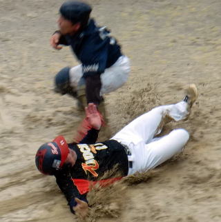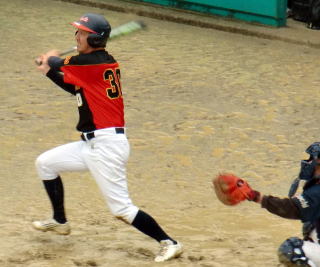 5回裏同点に追いつかれ迎えたタイブレーカー6回表無死2塁(谷平)2番剛世は,1ゴロに倒れるも谷平が三進し1死三塁,続く晴彦の三ゴロは相手野手が本塁への送球体勢で捕球したためラッキーな内野安打となり勝ち越し,続く繁隆は三ゴロに倒れ2死二塁から続く也寸志が左中間を破る二塁打で2点目,続く好調ギンザも中前打で続き3点をあげると本日2度のチャンスに2度とも三ゴロした勇人の左飛は相手野手のエラーを誘い4点目を挙げ勝利に近づいたかと思われたがその裏連打で5点を奪われ雨中の2時間15分の死闘に幕が下りた。最終的に雨の試合で裏の攻撃を取れなかったのが最後まで響いた試合となった。
