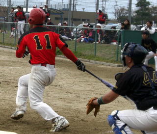 4回裏先頭の7番拓馬が二塁内野安打で出塁すると続く朋也も左前打で続き無死一二塁続く9番西森大がバント安打で無死満塁と三回に続きチャンスを掴むが1番上村がまさかの遊飛で1死!続く隆宏が一二塁間を破りこの回1点を挙げなお1死満塁も純の右飛から朋也がタッチアップするが右翼手の好返球で本塁寸前でタッチアウト!のダブルプレーとなりこの回1点で終了。5回表1点を奪われ6点差で迎えたその裏先頭の4番大地が左前打で出塁すると5番よしが特大の2点本塁打を右越えに放ちが逆転のムードが高まると6番侑毅が左越二塁打で再びチャンスを作るも7番拓馬8番朋也連続三振で2死!9番西森大も二ゴロに倒れ時間切れ!ゲームセット!!序盤の失点が如何ともしがたく悔しい敗戦となった。