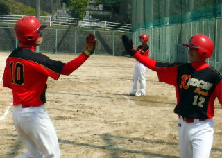 6回表二死一塁中越に2ランし純に迎えられる大地