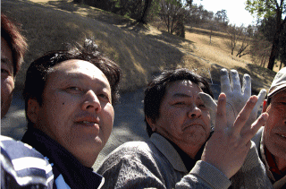 十分良い気分になった10:00前10番ホールからスタート。このホールは,ドラコンホールでしたが全員が見事にヘチ(高知の方言でとんでもない方向の意味)へ修二だけはフェアウェイでしたが隣の1番ホールでした。(写真参照)前途多難な出足に・・・不安になったのはキャディさんだけでは無かったようです。しかしながらメンバー全員が1番を終え11番ホールへと進み,オナーはダボの伸二・・・(汗)