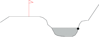 そんなこんだで迎えたホールインワンホールである14番ホール!オナーはおつぐさん,6番アイアンで放たれた打球は失速し手前のラフに・・・続く伸二も大きくショートし手前の斜面に・・・3番手は私,短く持ち抑えてカットに入れるも奥のバンカーへダイレクト・・・それを見た修二は抑えたのは良かったが大ダフリで池横のフェアウェイに大ショート(ティグランドに空いた穴をみておつぐさんが”おまえはイノシシか?”今度ダフル訳にはいかず2打目は大きく奥のバンカーへ・・・(私と同じ)そして奥のバンカーへ先乗りした修二が私のボールを指をさして大笑いしているではないか・・・何と奥の土手にめり込んでボールの一部が少し見えている状態でどう見てもアンプレアブルを宣言しないとみたいな状態でしたが(下図参照)ここで諦めたらおもしろい話が減ると思いそのままプレーし上がったら7打でした。(結果的にはあまりおもしろい話にはなりませんでしたへどね〜!)