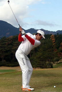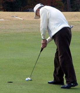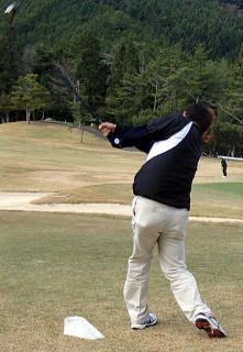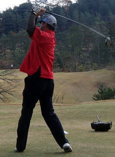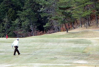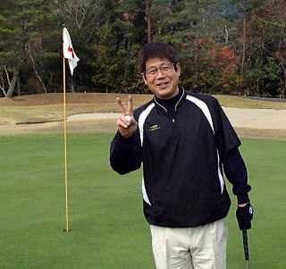 昼食をとり11:40予定のスタート時刻に”IN”のティーグランドに着くと前方のコースに人影はありませんでした。取り急ぎ折り返しをスタートし事件が起きたのは11番296YPar4のグリーン上でした。全員がグリーンに上がり私が旗を抜きグリーンの端に置いたのですが自分のボールに戻り見てみると”よっちゃん”ライン上で入らずにオーバーすると当たるかも?と心配になりよっちゃんに確認するも「俺もそれに当てるようやったらゴルフをやめる」みたいなことを言ってパットしたよっちゃんのボールは3mの大ショート!私の置いたフラッグが気になったのかと申し訳なさそうによっちゃんを見ると本人は満足げに頷きながらボールに歩み寄りマークをしパーを確信したような顔でボールを拾い上げた瞬間よっちゃんが「穴をまちごーた!」と大声を上げ落ち込む姿が・・・。前に使用していたカップを埋めた個所をカップと勘違いし打ったとのことらしいのですが,,本人曰く「白く光ってどう見てもカップにしか見えんかった」とのことで結局そのホールはボギーとしてしまい,以降も落胆は大きく13番ホールでは,ティーショットは良い当たりながらキックが悪くOBにそしてプレイング4の打ち直しもシャンクし結局このホール「9」を叩き優勝戦線から脱落していきました。