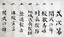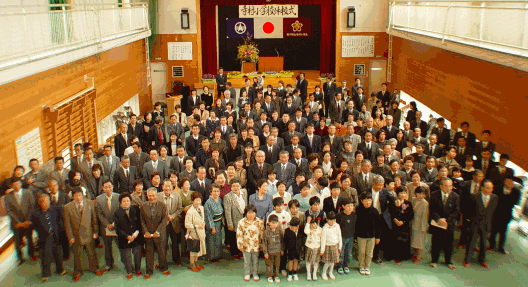3/21卒業式に引き続き休校式が行われ吾川村関係者・歴代教員・地域住民200人以上が続々と集合し惜しまれつつも127年の寺村小学校の歴史に区切りをつけた。藤崎村長の挨拶のあと地域を代表し岡崎友則さんが寺村小学校時代の懐かしい思いでを語り,岡林教育長より休校に至る経緯が紹介されたあと片岡教育委員長より休校宣言がなされた。127年間新入学ゼロが1回もなく休校できたのは大変嬉しくもあり,いかにも寺村らしい潔さを感じます。最後にPTA会長の音頭による3本締めで127年の歴史に幕を下ろしました。