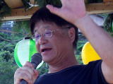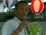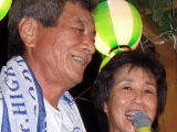 大盛況のカラオケを中断し行われた【紙飛行機大会】には,40人のエントリー(遠くは,イギリス近くは東条まで)があり大盛り上がり,今年は北の国のミサイル等の諸問題もあり特別ルール「ロケット型禁止」で行われ違反した場合には,副町長が責任を持ってPAC3で撃墜するというものでしたがいきなり10mを超す好記録が出るかと思えば,マイナス2.7mなどの珍記録で盛り上がりましたが,激戦を制したのは11m97cmの好記録をたたき出した上屋敷のおつぐさん(写真参照)で初優勝を見事メジャー大会で飾りました。
